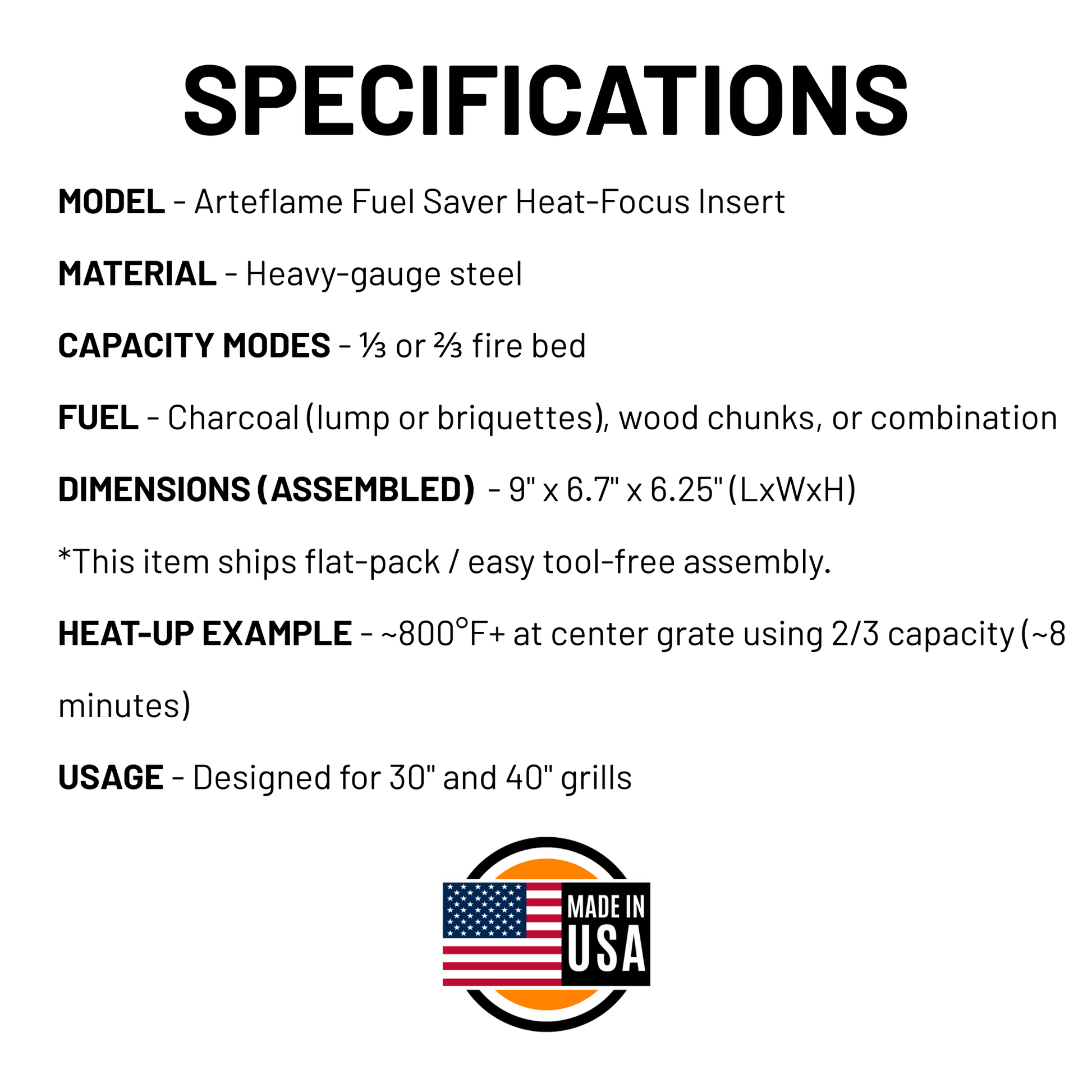 The Arteflame Fuel Saver ships flat and assembles in minutes by sliding the individual pieces together. The fire base is positioned so that you can either use 1/3 or 2/3 of the capacity. When using just 1/3 capacity in a 40" grill, the center grill grate reaches 400F+ in under 8 minutes.