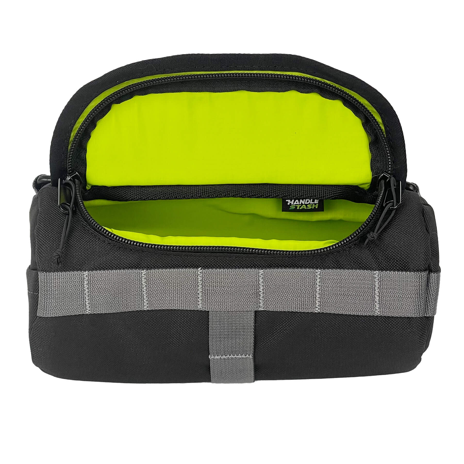 Black outer for a classic low-key look, and a lime green liner that’s so bright you may distract low flying aircraft. The coordinated wolf-grey webbing gives you tons of ways to strap it to the bike and strap extra gear to the outside. Sling it over your back with the optional strap and clip your tail light to the webbing for quick rides to the store or pub.