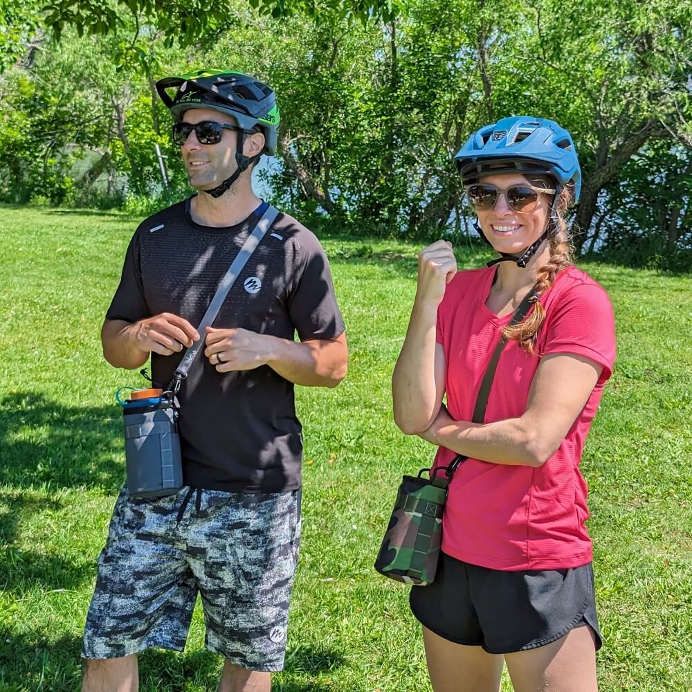Add a sling strap to your handlebar bag or stem bag to carry it off the bike.