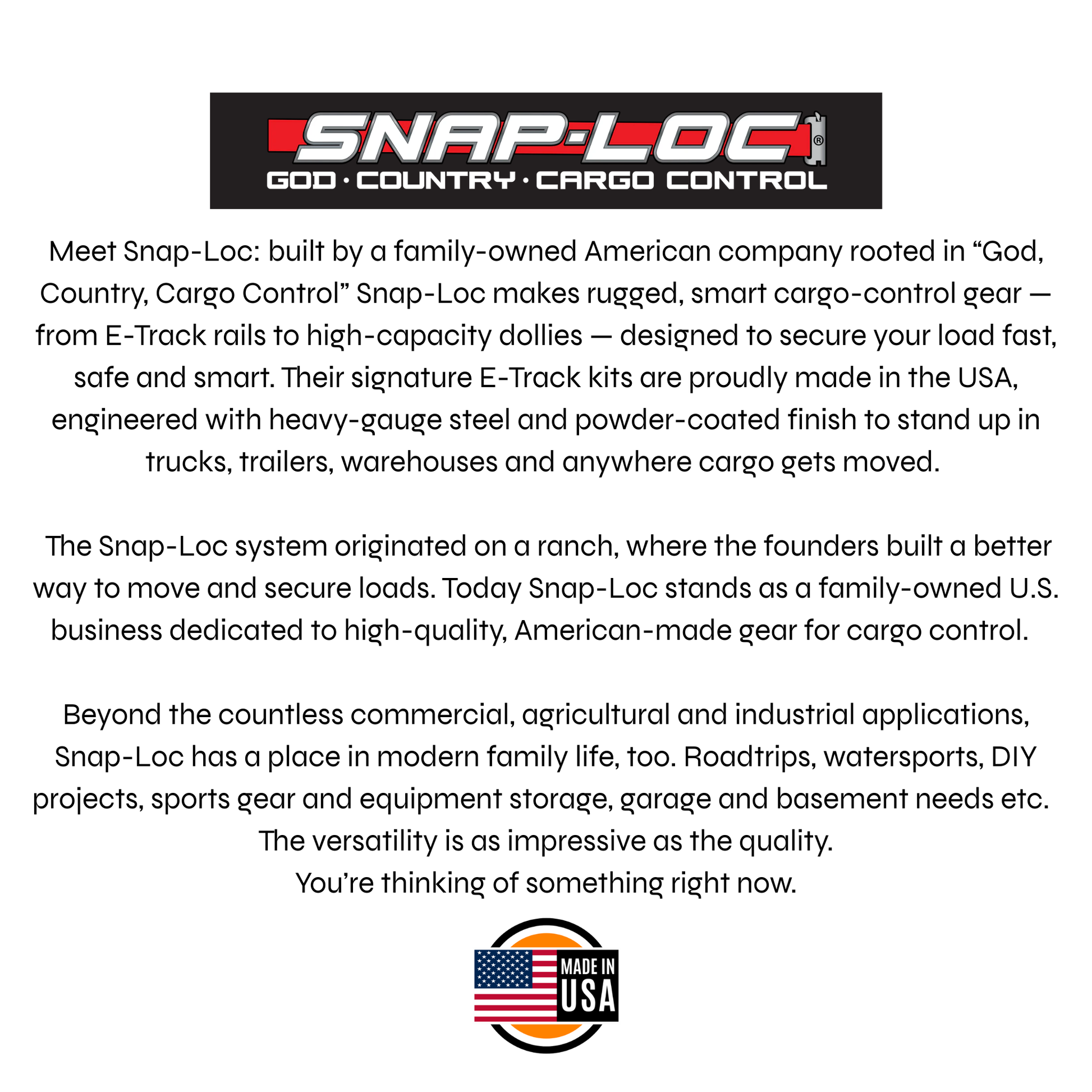 THE SOLUTION: The Snap-Loc E-Track Single System securely anchors all sized cargo items where you need it, uses long-lasting 2 inch wide professional movers straps and stows away neatly in small spaces. You're going to love it! Our E-Track System also coordinates with the Snap-Loc Dolly System to easily move more in less time with high-capacity smooth rolling casters, E-Track Strap attachment and Push Cart Panel Cart conversion.