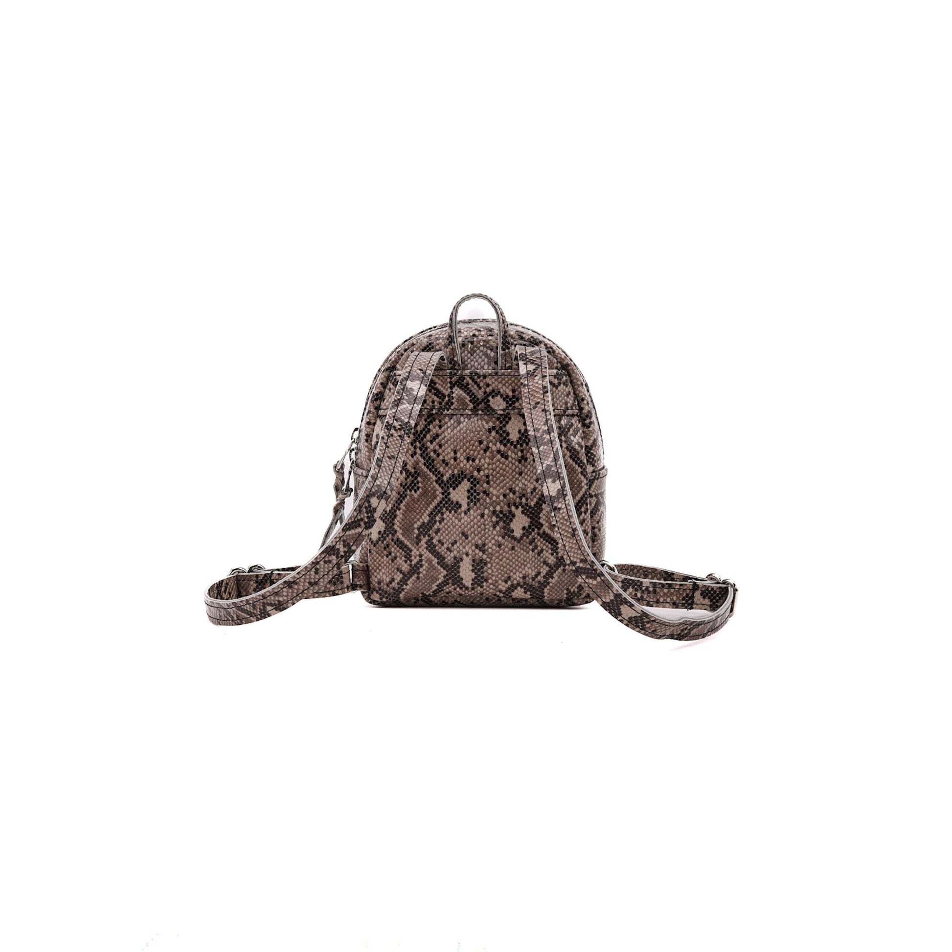 - Silver hardware: D-links, strap slides, and double zipper heads
